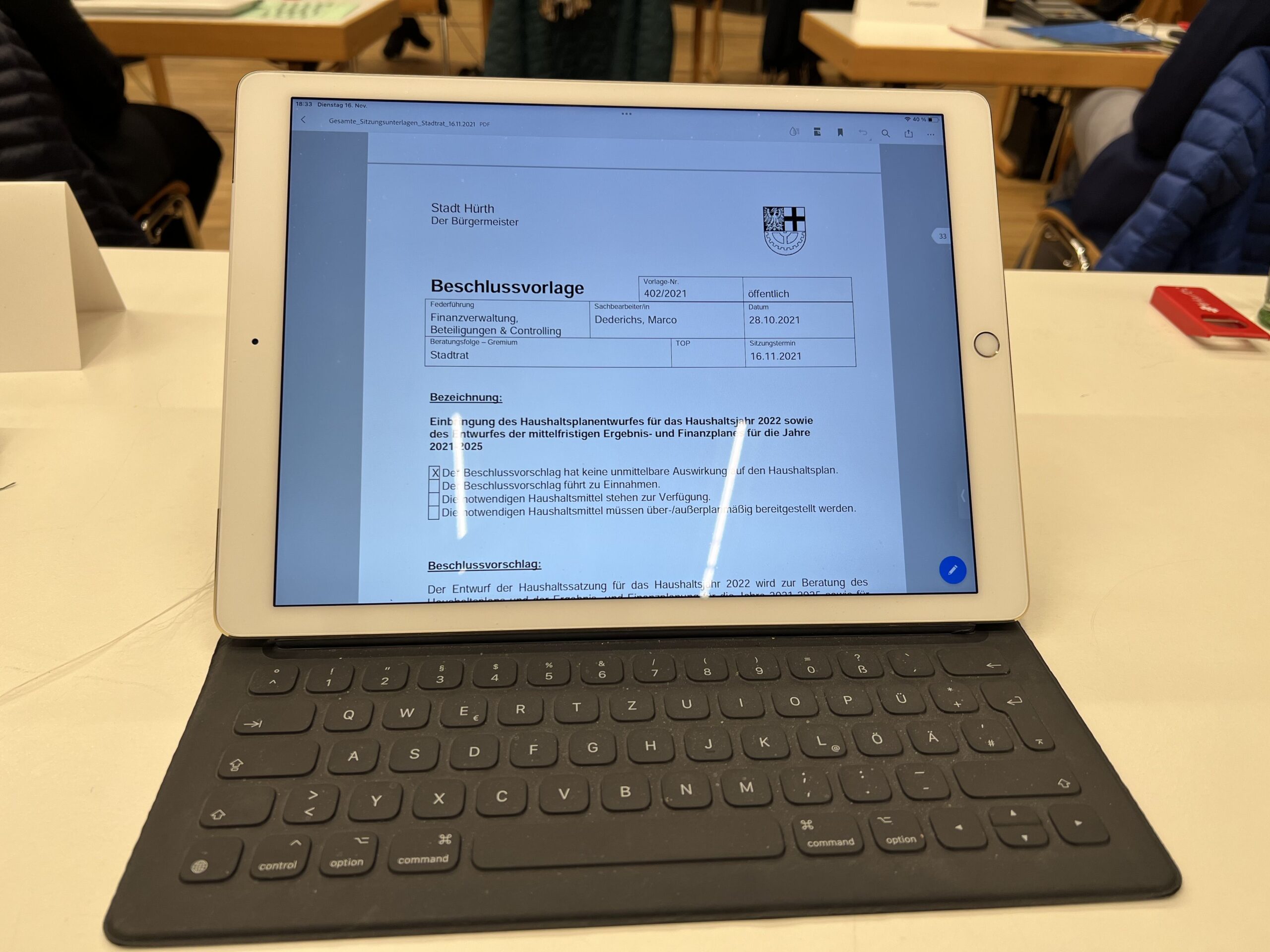 Weiterlesen72 Millionen aus der Ausgleichsrücklage verplant Der Kämmerer Marco Dederichs brachte gemeinsam mit unserem Bürgermeister den Haushaltsentwurf 2026 ein. Weiter zeichnet die Rede des Beigeordneten für Finanzen ein klares Bild. Die Stadt steht unter finanziellem Druck. Die Erträge stagnieren. Zudem steigen die Ausgaben in vielen Bereichen. Das macht die Lage strukturell schwierig. Die wichtigsten Zahlen […]
